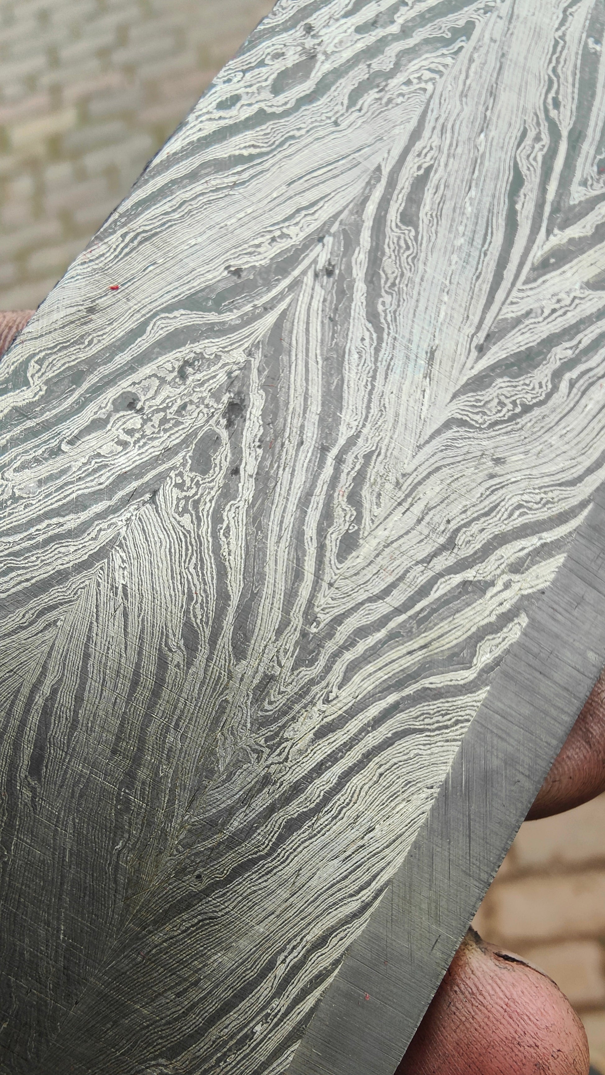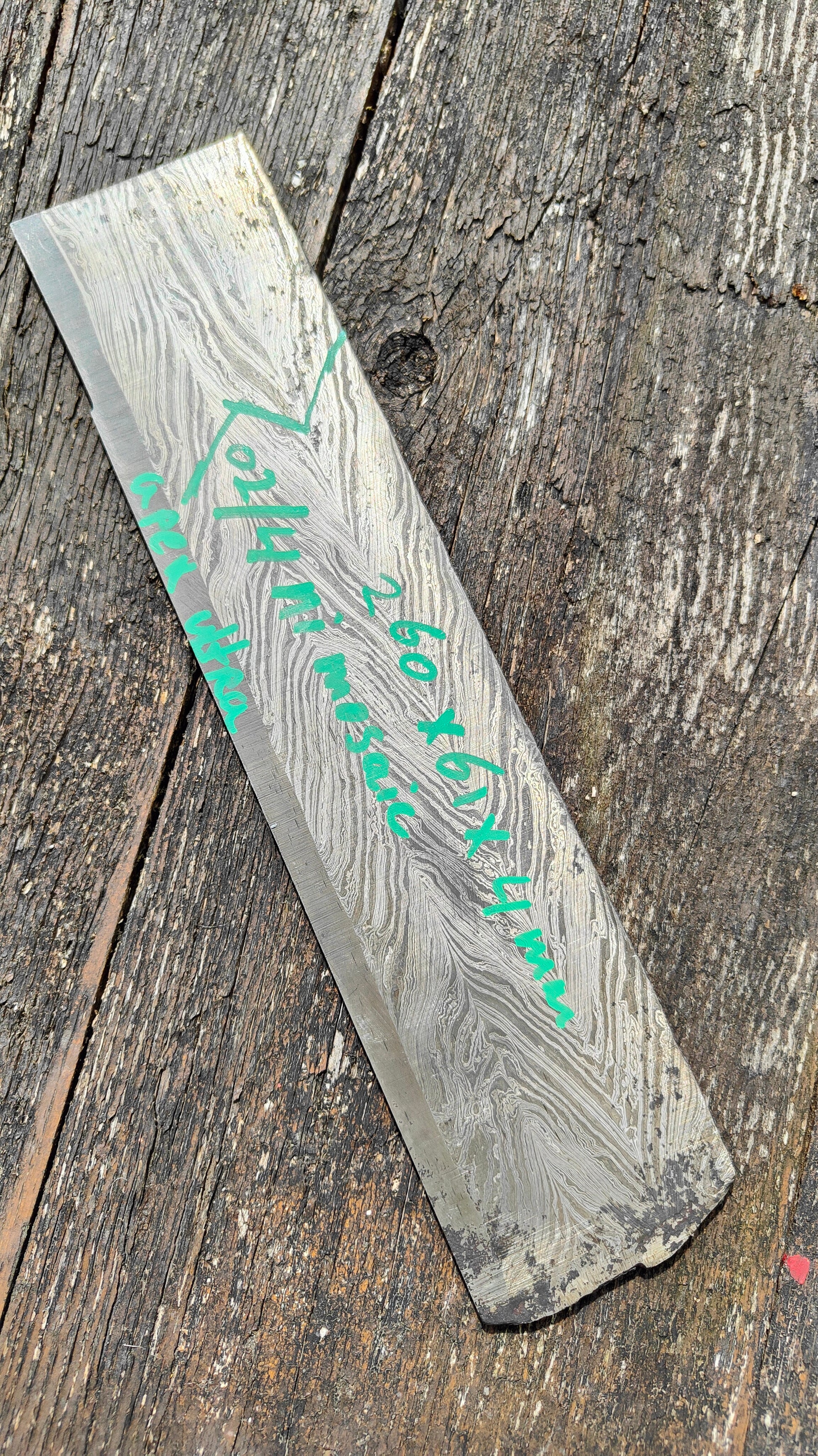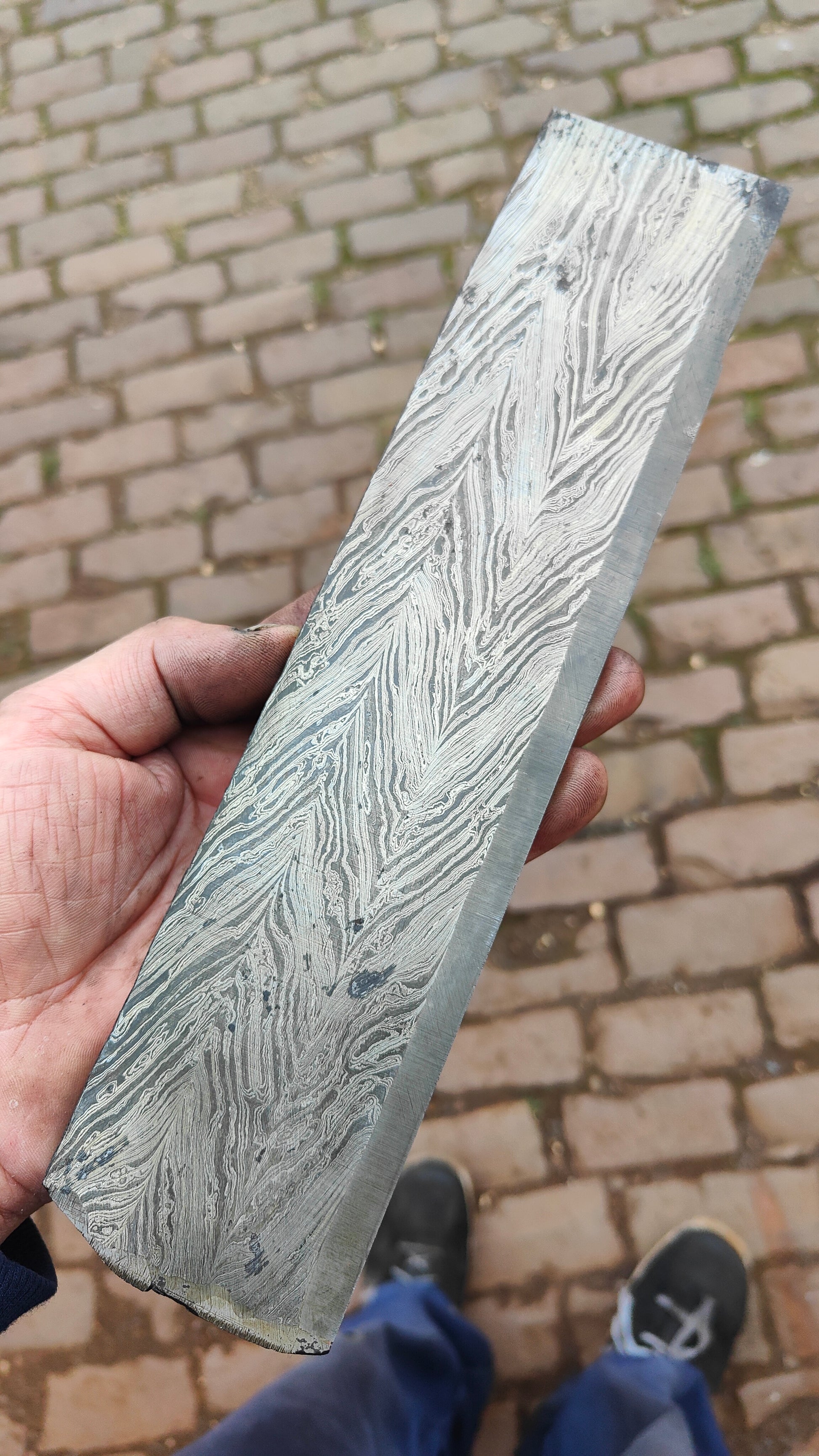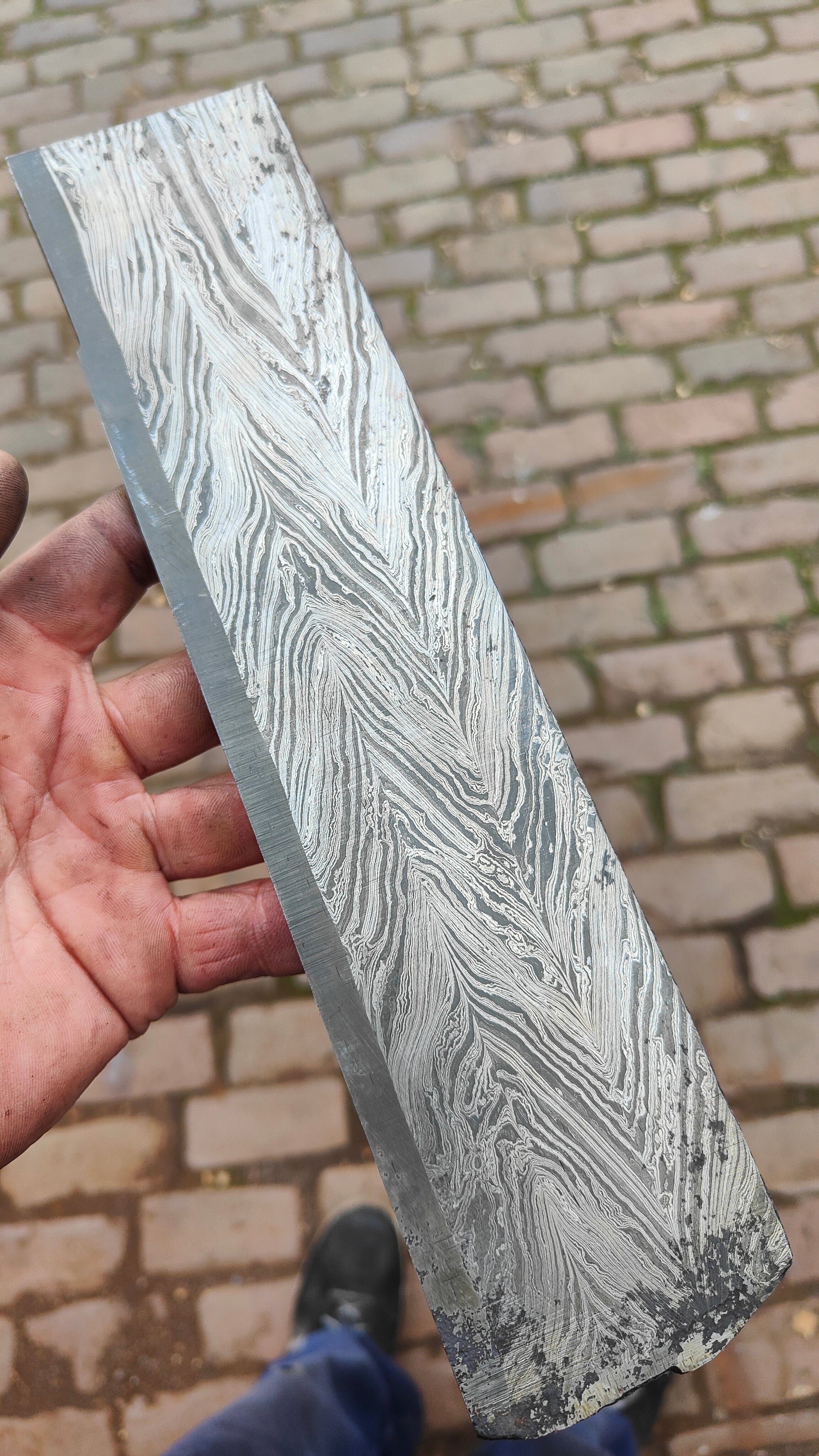 forge welded apex edge onto a body of 4 bookmatched alternating bars of a twisted 4 nickel alloy mosaic (1.2842/75ni8/1,2767/invar36/99.8 ni)