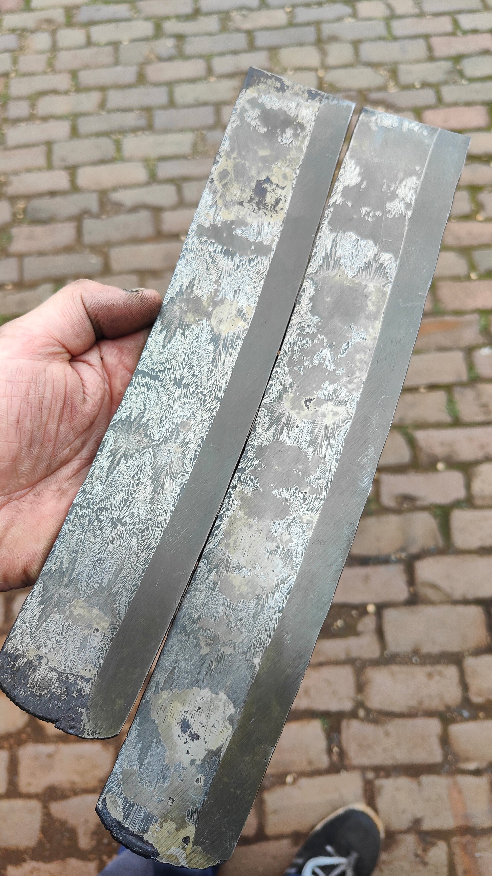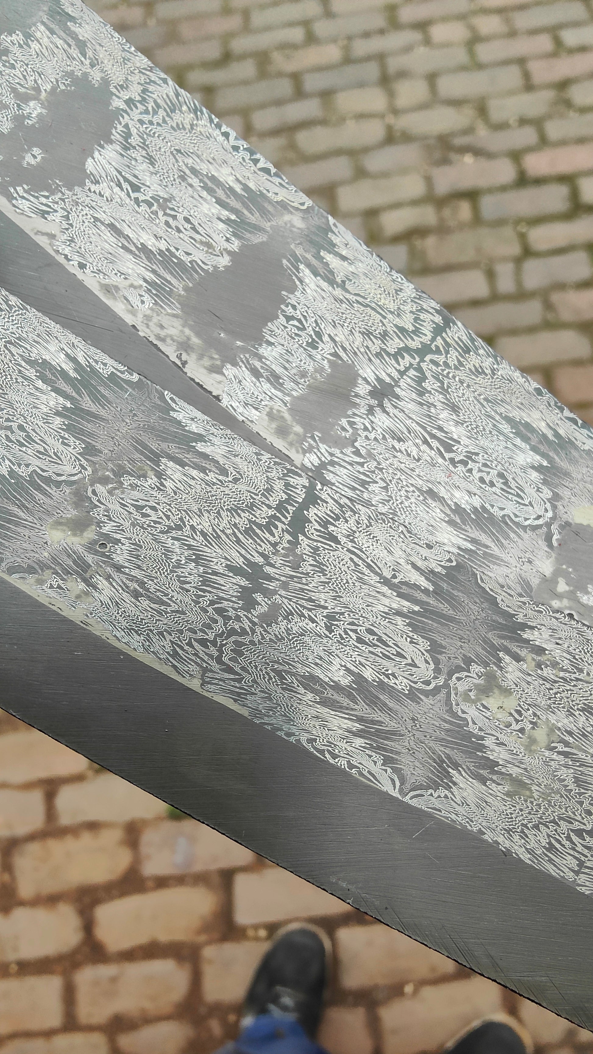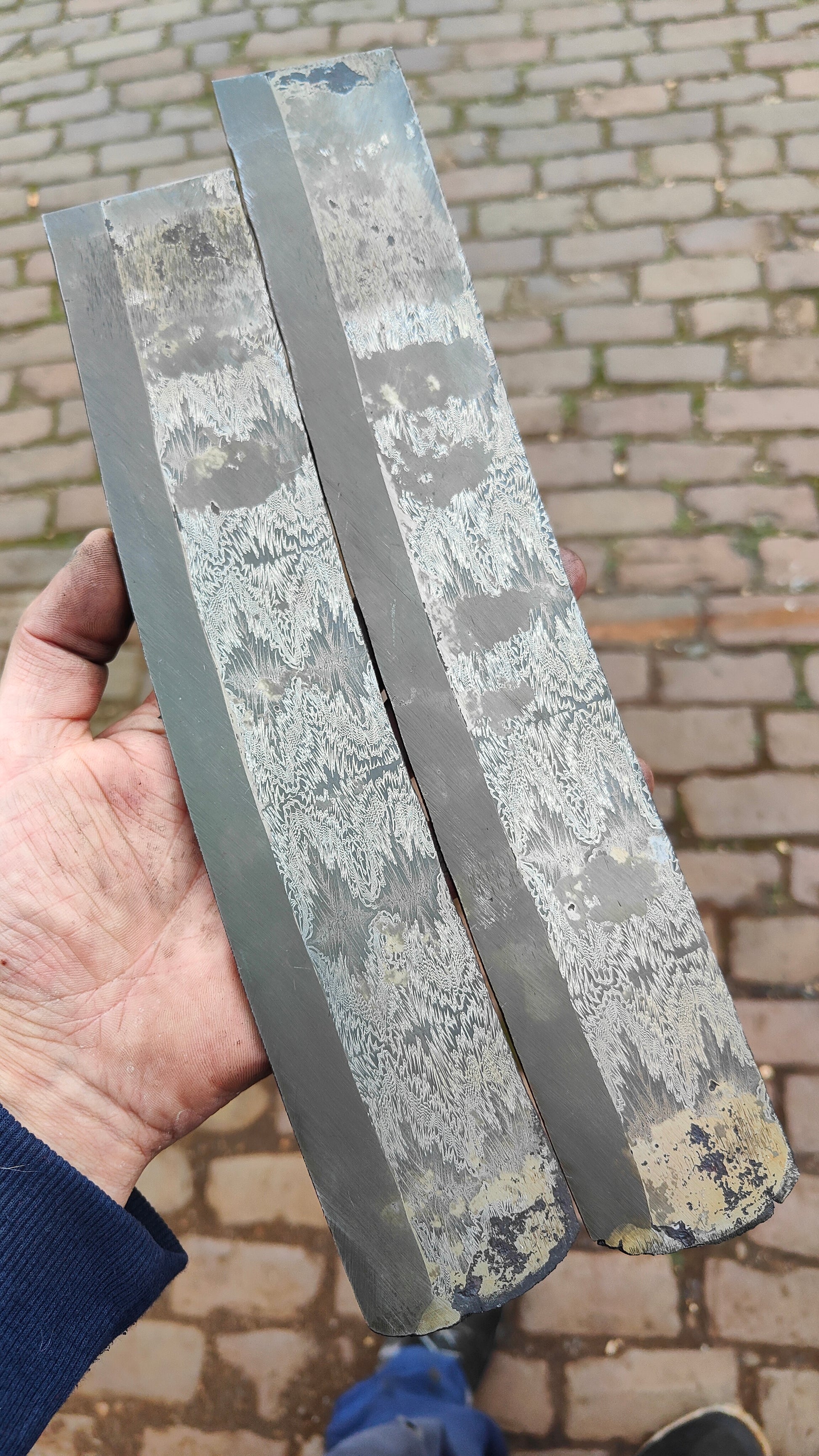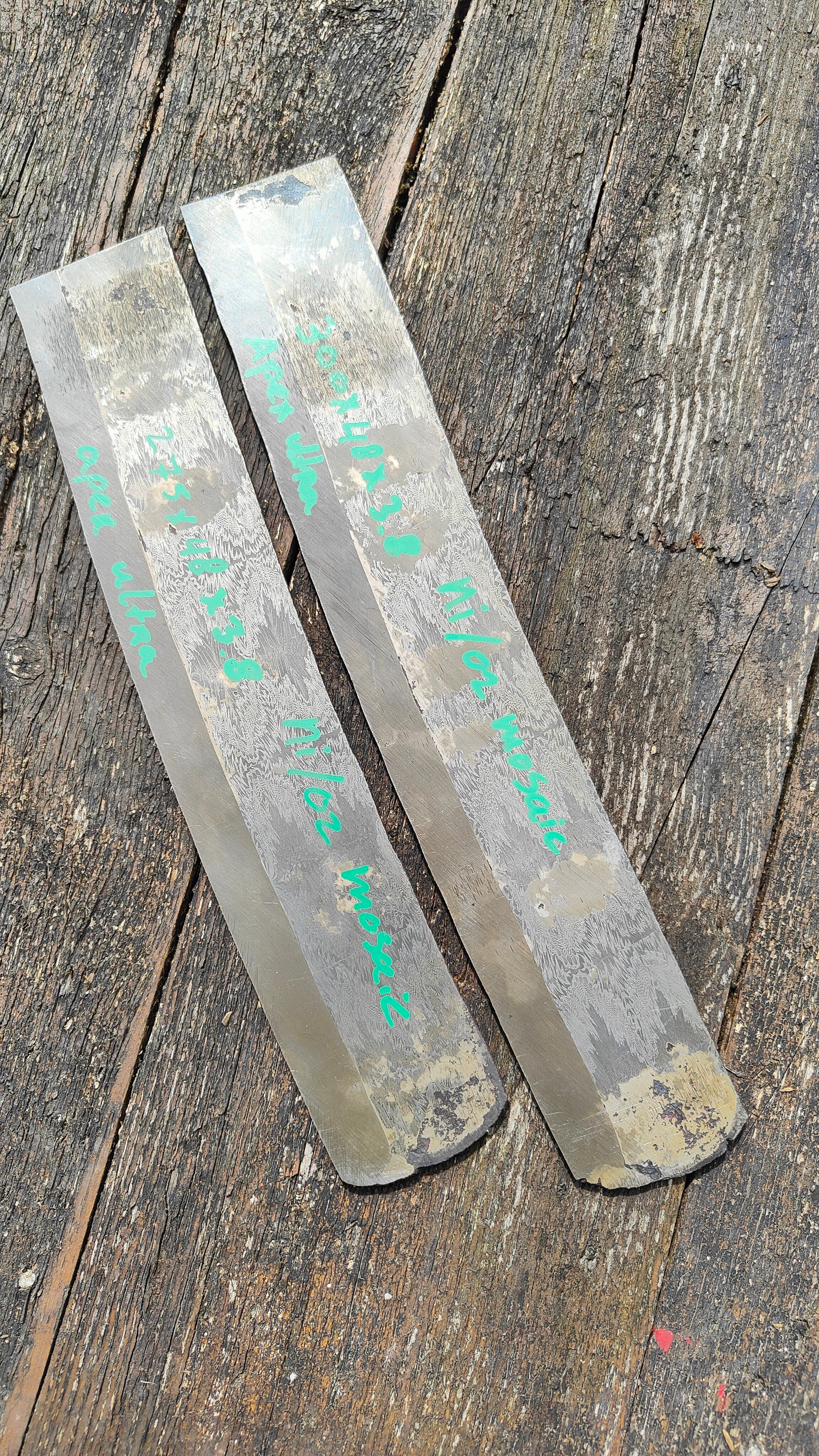 forge welded on apex ultra edge on a fine nickel and 1.2842/02 toolsteel mosaic (spots are last bits of protective cladding and will grind out)
